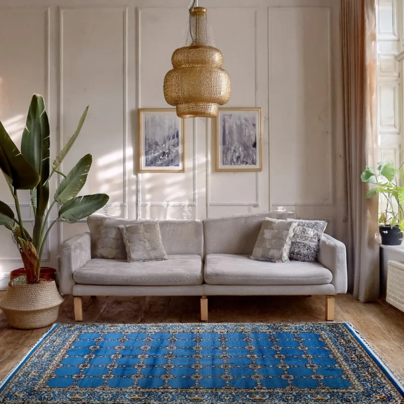 Bring timeless sophistication into your home with the Bukhara Blue Elegance Rug. Showcasing a rich blue-on-blue palette, this rug features a classic medallion lattice pattern bordered with intricate floral motifs in ivory, gold and navy. The harmonious blend of colours adds a sense of calm and tradition while making a striking visual impact.