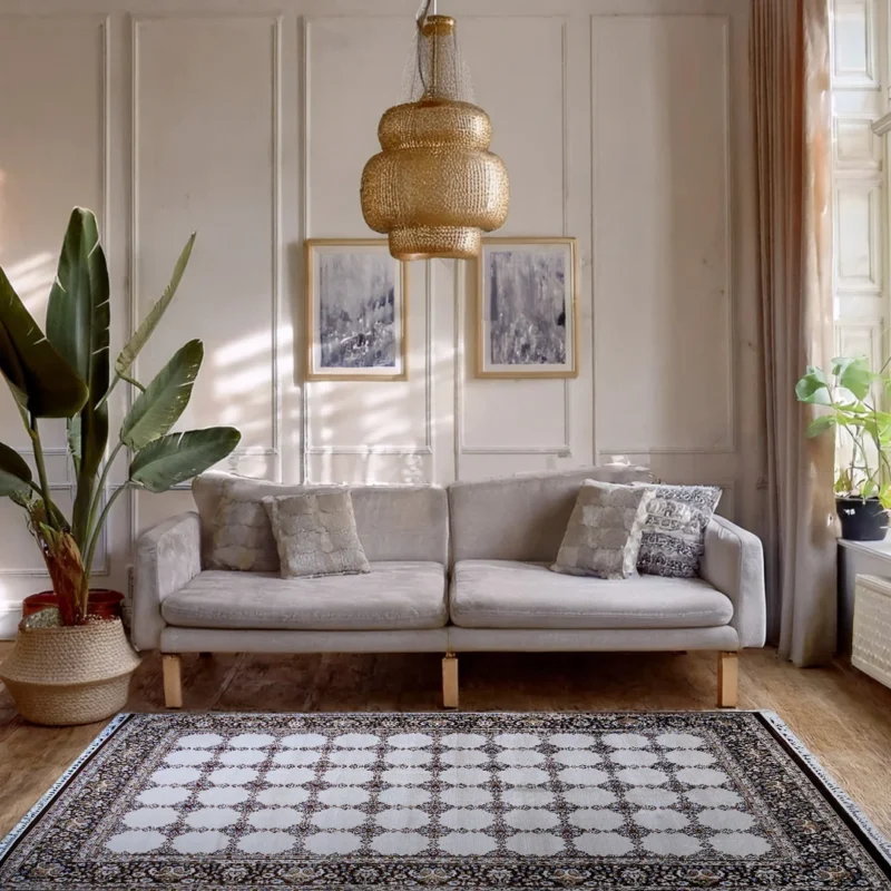 This colourway brings warmth and balance to both contemporary and classic interiors. The neutral base keeps the space feeling open and airy, while the darker border adds structure and contrast. Ideal for living rooms, offices or formal areas, this rug complements a wide range of interior palettes.